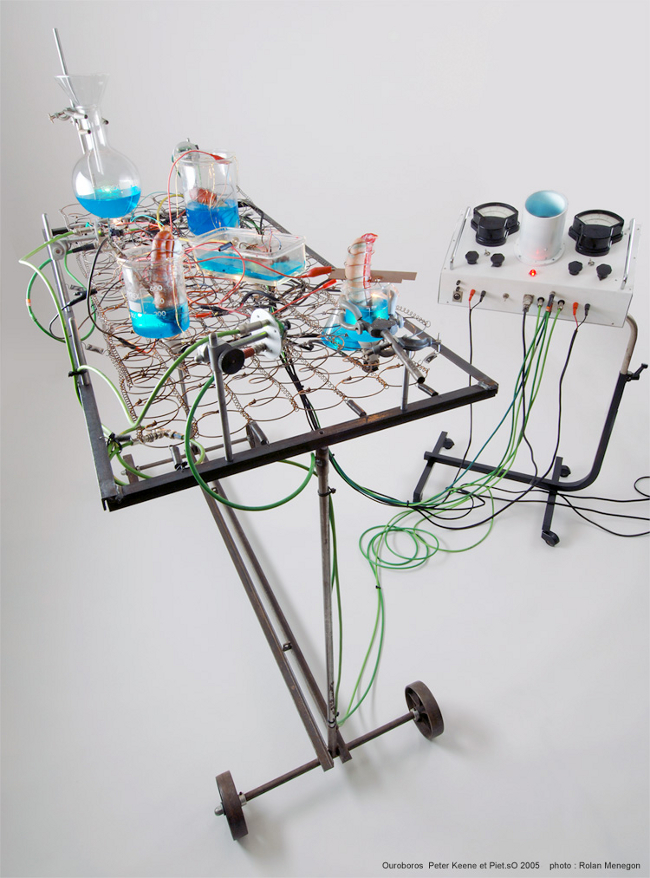 Ouroboros is one of many ongoing alchemical experiments conducted by Piet.sO and Peter Keene since 2001. This installation explores the long slow process of putrefaction and fixation.